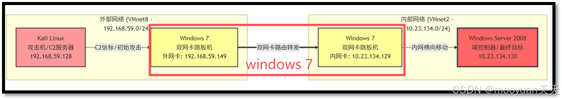 本篇文章的靶场vulnstack5拓扑如下所示,由一台Windows7设备以及一台Windows Server 2008组成,其中Windows7有两块网卡,分别连接内网和外网。