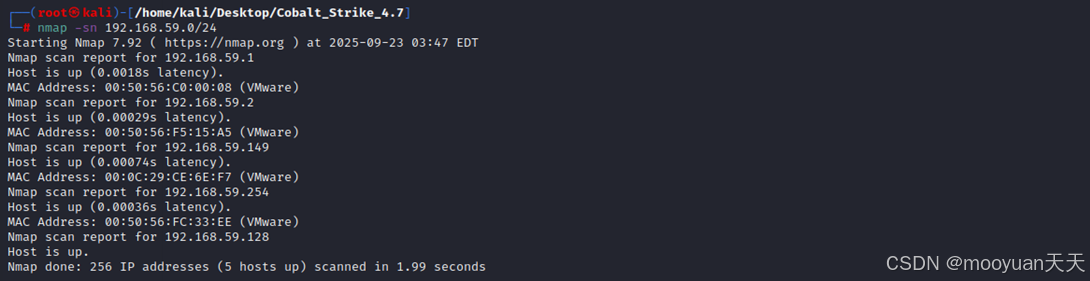 使用nmap探测vmnet8网段192.168.59.0/24,目的是找出网络中有哪些活跃主机,命令如下所示。