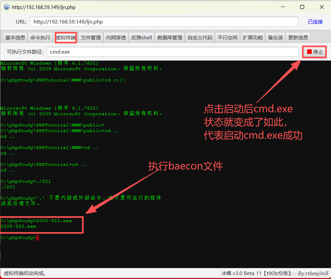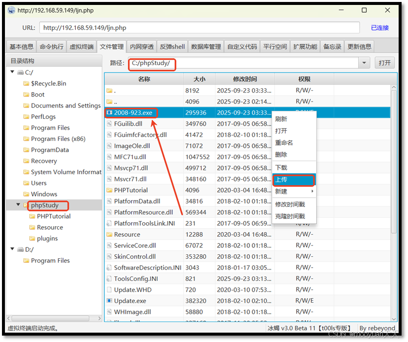 2、通过冰蝎上传baecon文件2008-923.exe到服务器中