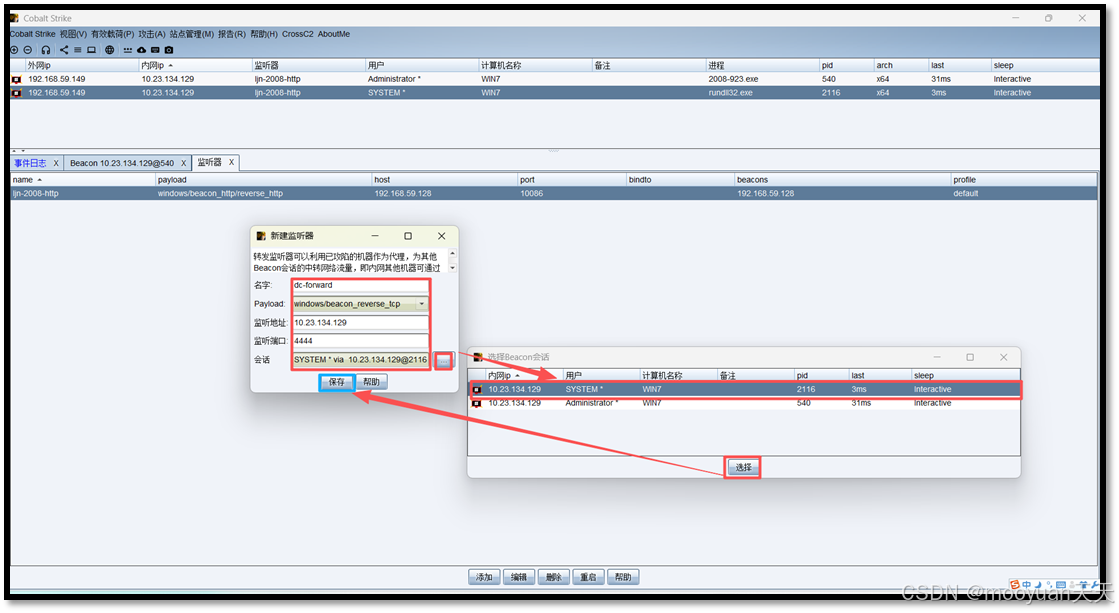 上线内部主机 :可以通过多种方式让内部网络中的目标主机连接到刚刚创建的中转监听器,从而上线到 Cobalt Strike。