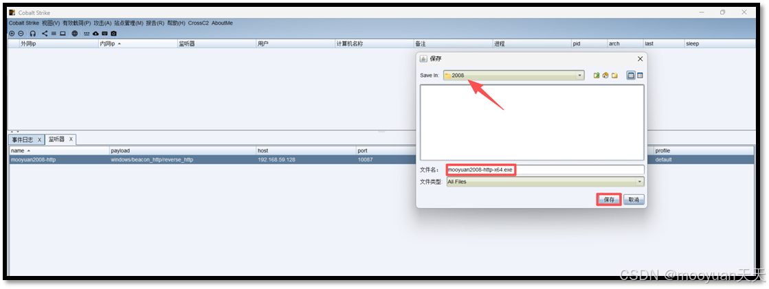 这时监听器选择mooyuan2008,输出格式windows exe,输出格式选择目标靶机win server2008匹配的的x64格式,点击生成后,会提示保存,将其保存并命名,这里我选择命名为mooyuan2008-http-x64.exe,保存到了f:/2008/目录中。