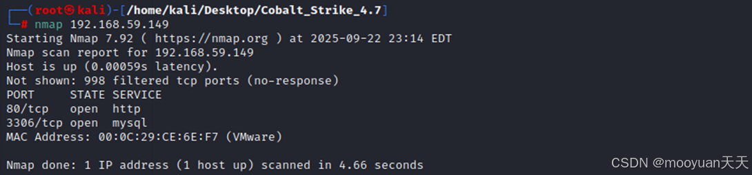 分析扫描结果,通过对192.168.59.0/24网段的主机发现扫描,成功识别出5台活跃设备。其中192.168.59.128为Kali攻击机,192.168.59.1是Windows宿主机,192.168.59.2为VMnet8网关。综合分析确认192.168.59.149为跳板Web靶机,该设备是网络中唯一的未知业务主机,位于合理攻击路径上,应作为后续渗透测试的首要目标,重点进行端口扫描和服务识别,具体如下所示。