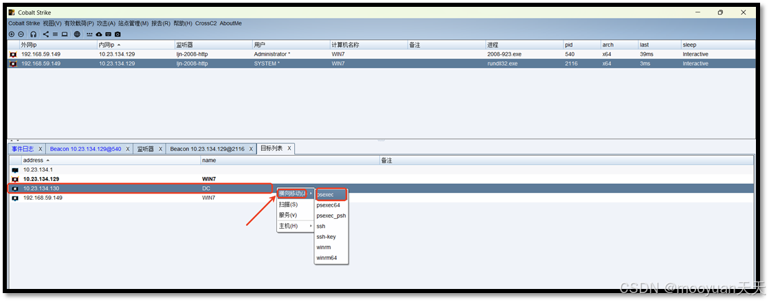 在视图-目标中找到DC 10.23.134.130,右键-横向移动-psexec,如下所示