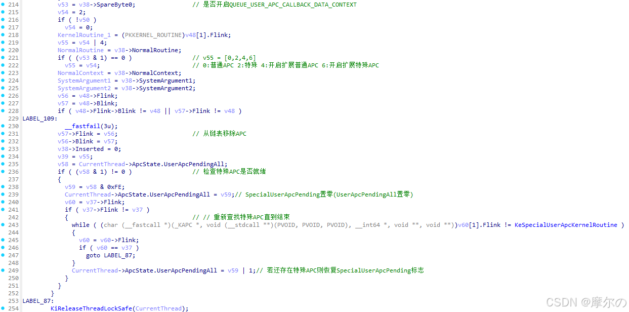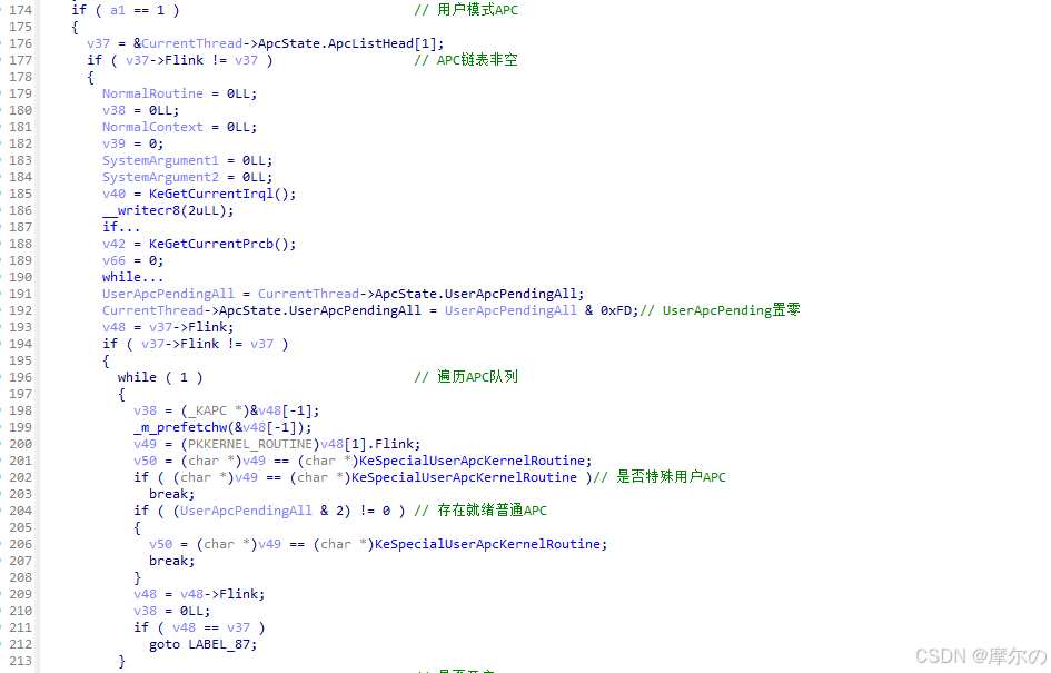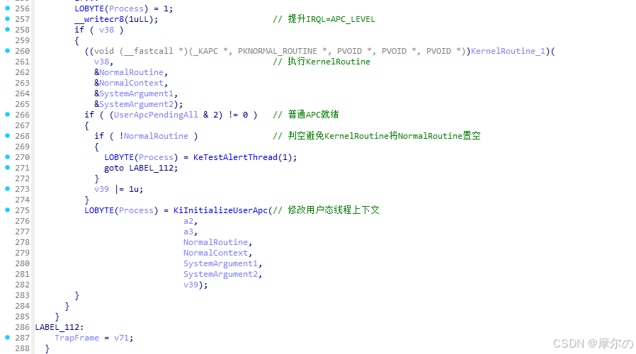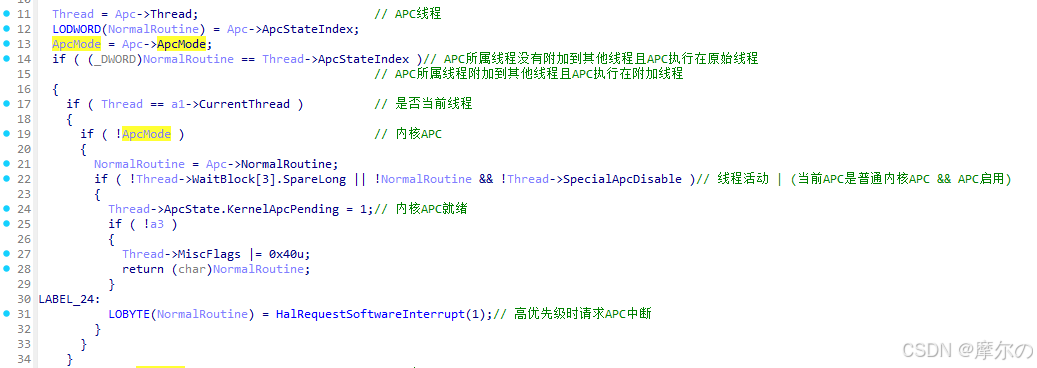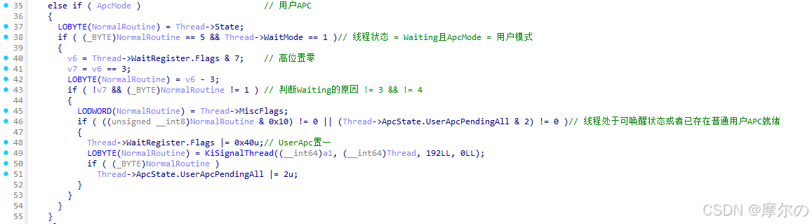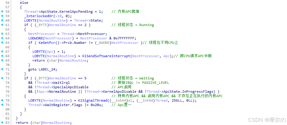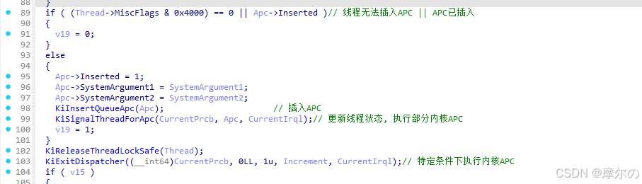 KiSignalThreadForApc函数根据当前线程、APC信息决定是否更新线程状态,优先执行某些内核APC。