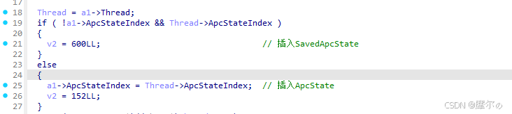 Thread->ApcStateIndex代表线程是否附加到其它线程,SavedApcState用于备份线程的原始APC,ApcState指向当前活跃的APC。从上图可以看到, -