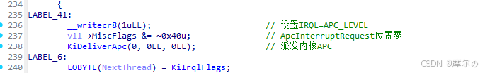 KiExitDispatcher函数通过调用KiDeliverApc执行内核APC。