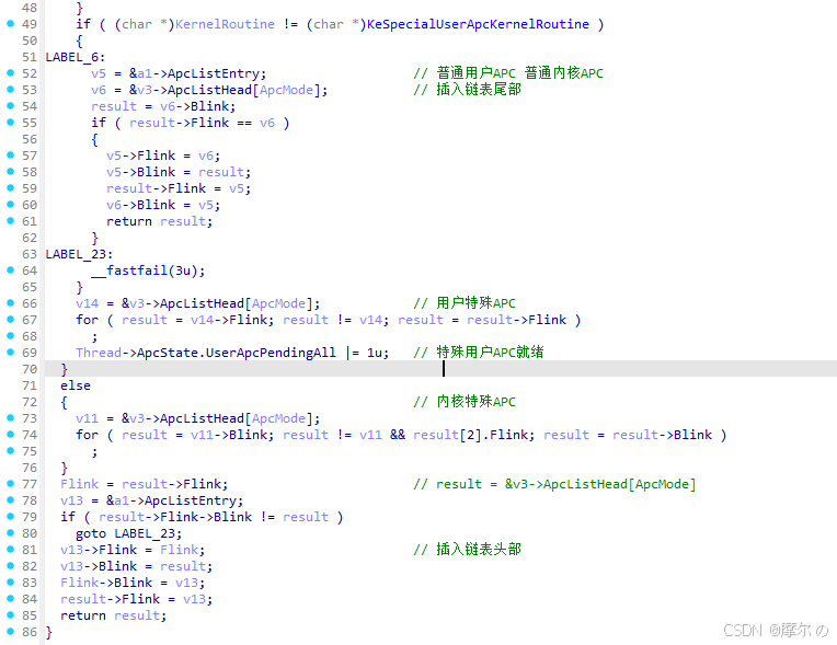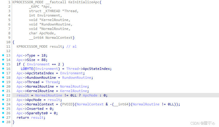 从上图代码中可以看出,KeInitializeApc只是简单通过传参初始化APC结构,没有什么复杂业务。