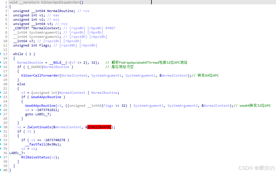 KeUserApcDispatcher直接执行APC,或者通过wow64转发,最后调用ZwContinueEx回到内核