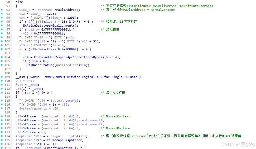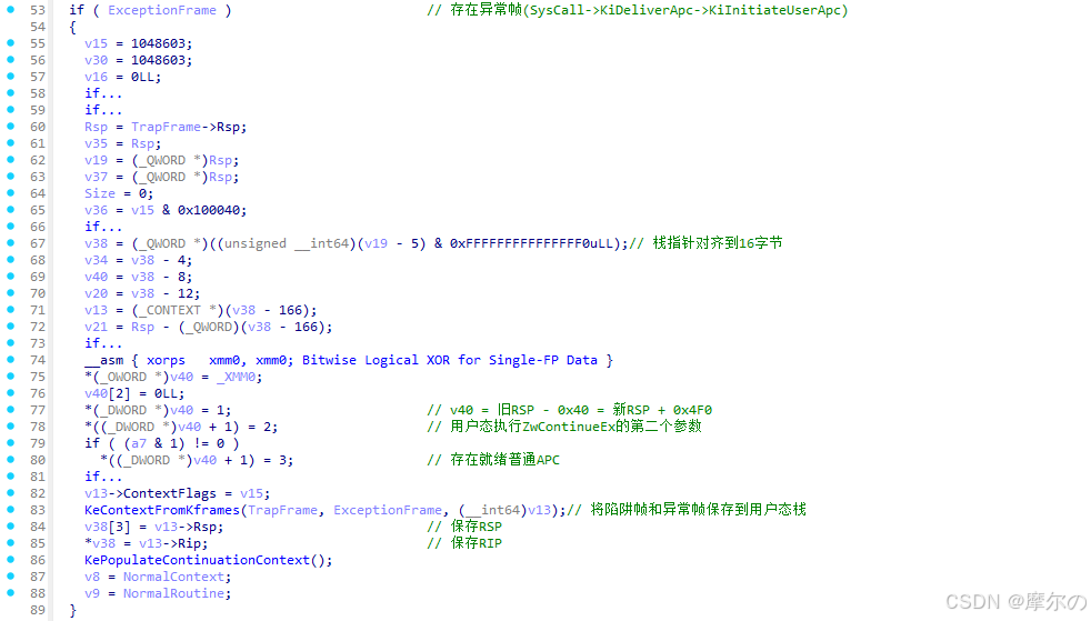 两者的区别在于从KiContinueEx进入时会复用上一次执行APC时的地址,避免反复备份KTRAP_FRAME。