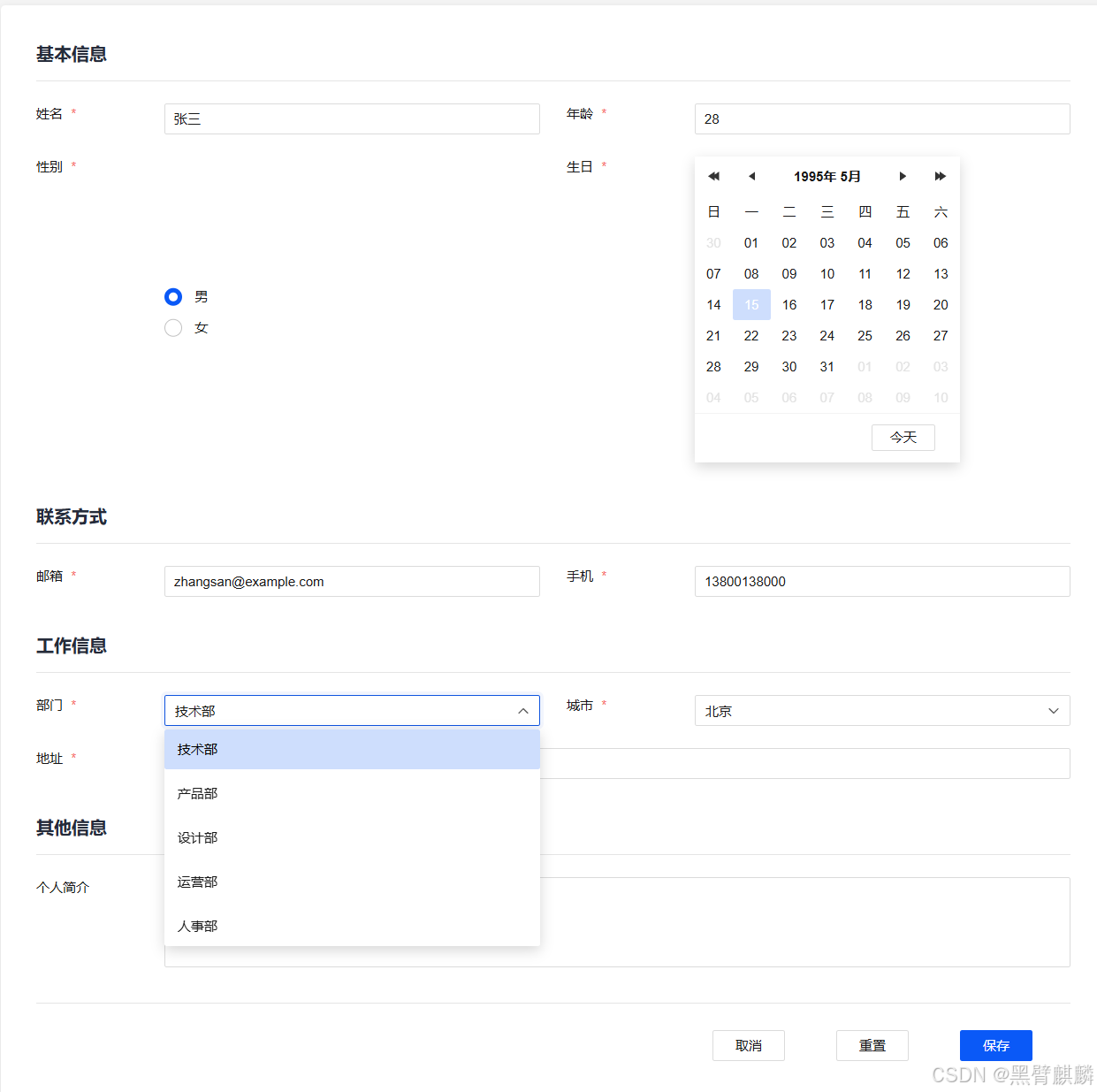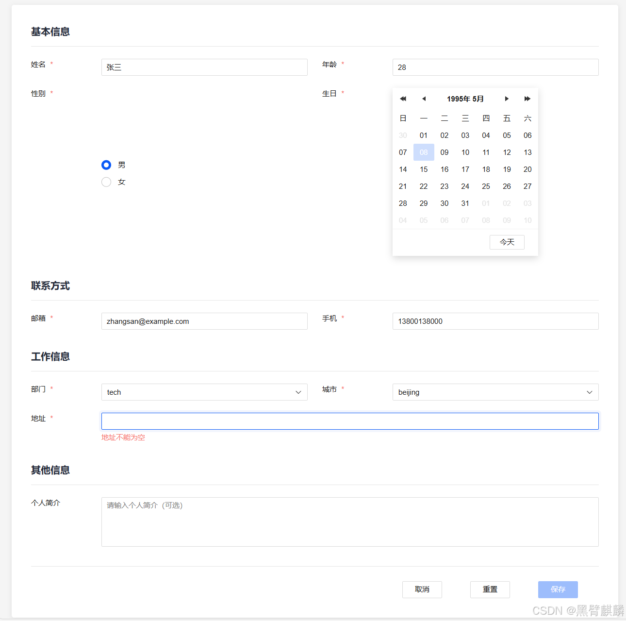 表单是 Web 开发中最常见的交互组件,几乎每个后台管理系统都离不开它。我在使用 DevUI 的 Form 组件时,发现它的文档虽然全面,但实际项目中会遇到一些细节问题。这篇文章就是基于一个真实的个人信息编辑表单案例,讲讲怎么用 DevUI Form 组件,以及一些容易踩的坑。