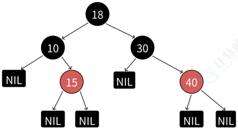 - 如果一个结点是红色,则它的两个孩子结点必须是黑色,也就是说任意一条路径不会有连续的红色结点