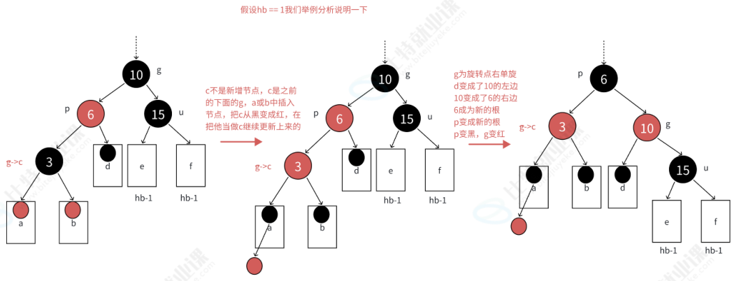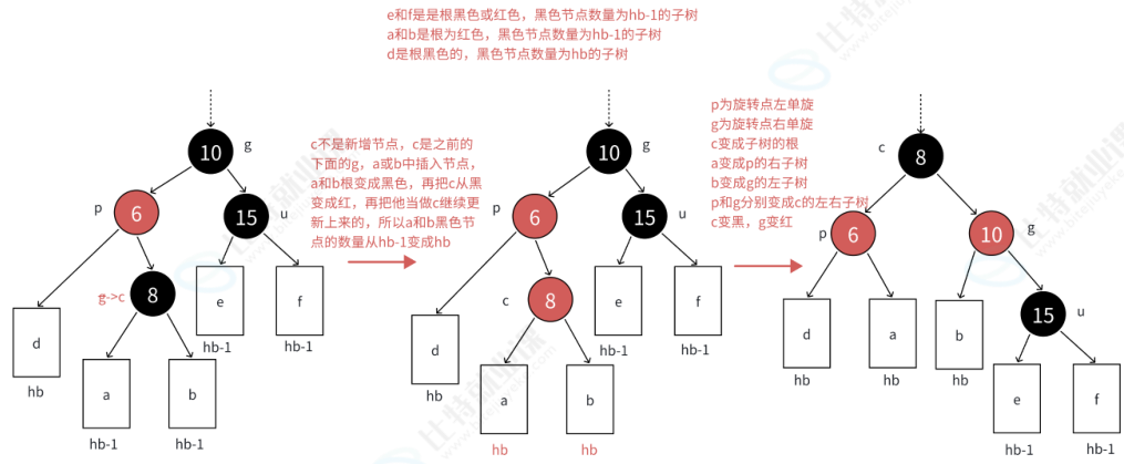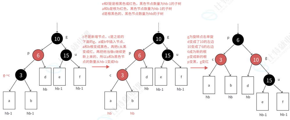 - 下图将以上类似的处理进行了抽象表达,d/e/f代表每条路径拥有hb个⿊⾊结点的⼦树,a/b代表每条路径拥有hb-1个⿊⾊结点的根为红的⼦树,hb>=0。