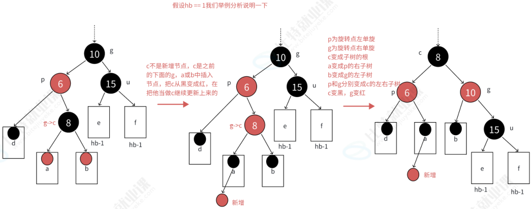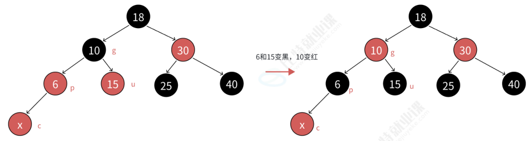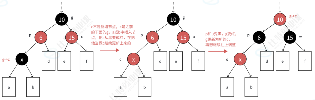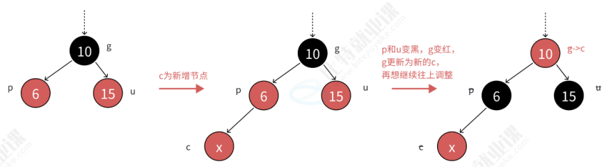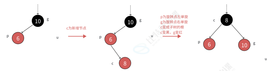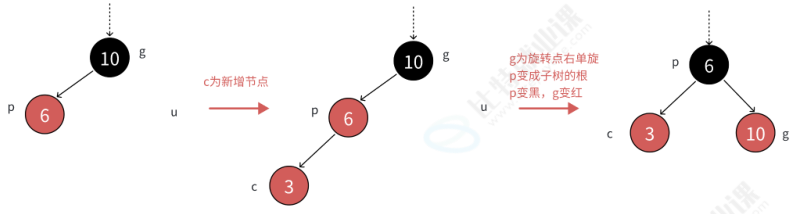 c为红,p为红,g为⿊,u存在且为红,则将p和u变⿊,g变红。在把g当做新的c,继续往上更新。