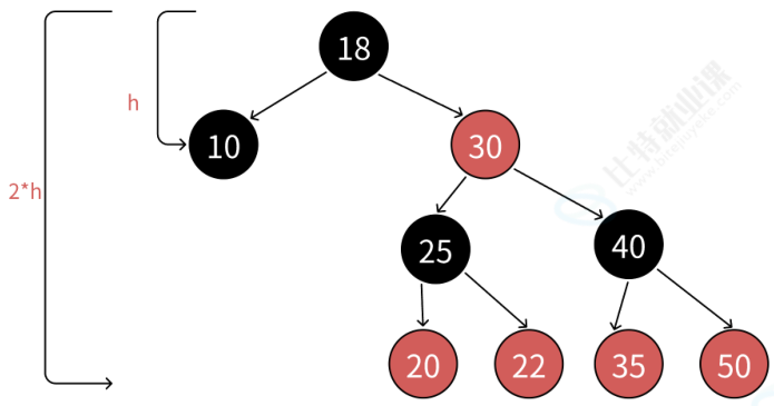 - 由规则2和规则3可知,任意⼀条路径不会有连续的红⾊结点,所以极端场景下,最⻓的路径就是一黑一红间隔组成,那么最长路径的⻓度为2*bh。
