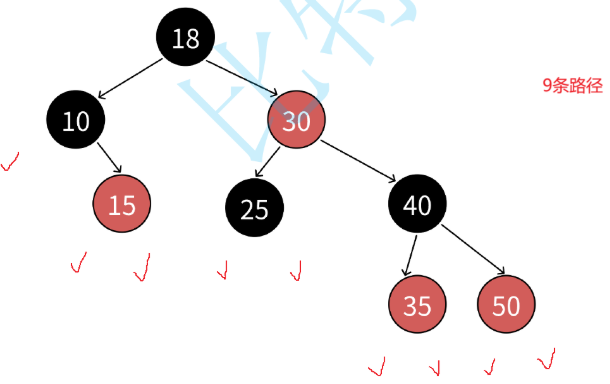 注意,路径是从根节点到NIL的所有情况,上面的红黑树就一共有九条路径