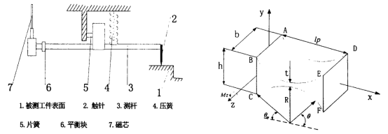左:测头结构示意图;右:变截面薄片簧结构示意图