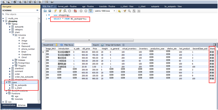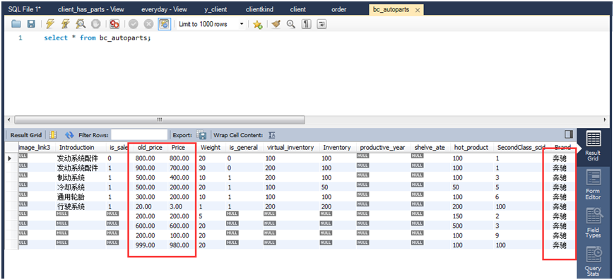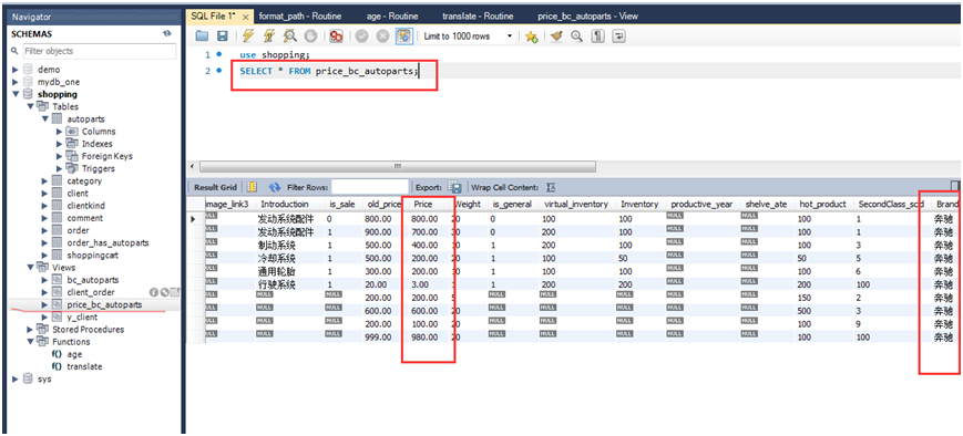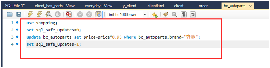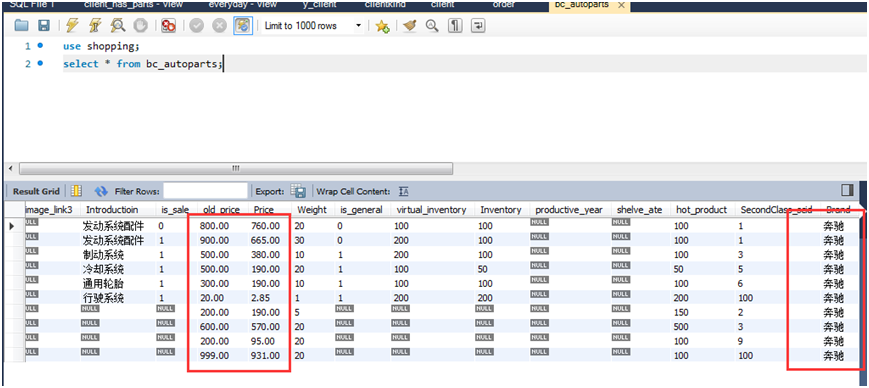 (1)将'奔驰'品牌的价格下调5%,用Select查询更新前后结果。