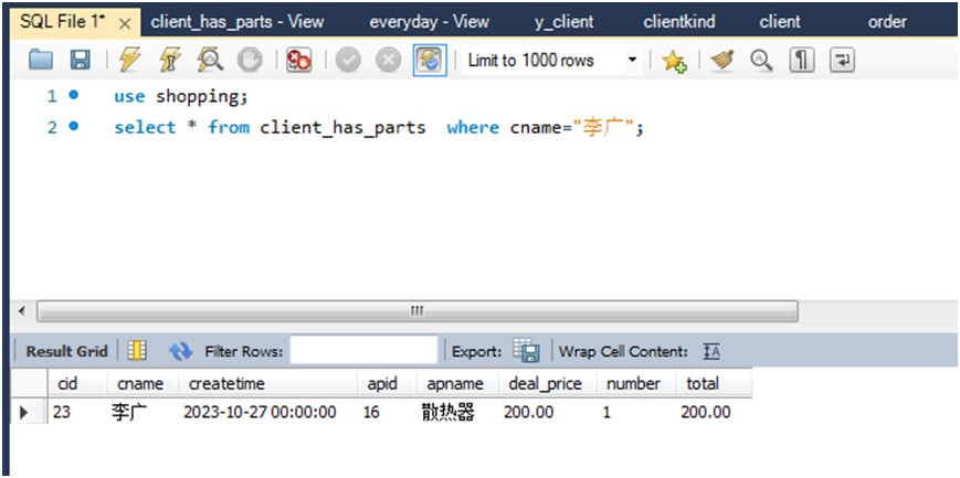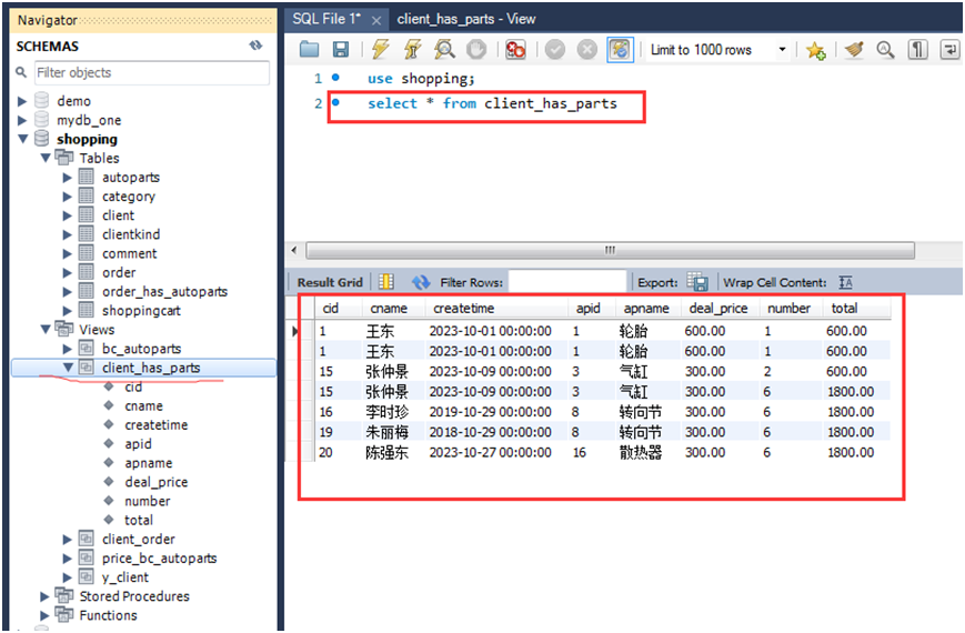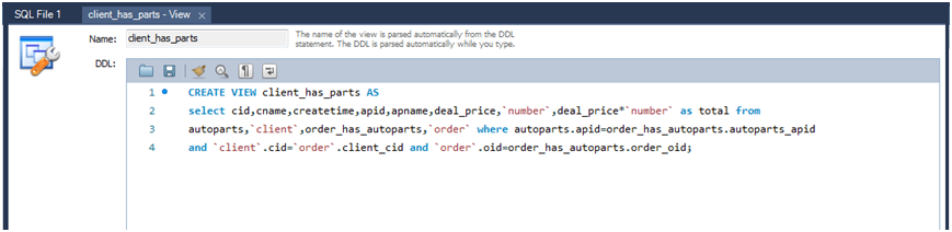 create view client_has_parts as select cid,cname,createtime,apid,apname,deal_price,`number`,deal_price* `number` as total from autoparts, `client`,order_has_autoparts,`order` where autoparts.apid=order_has_autoparts.autoparts_apid and `client`.cid=`order`.client_cid and `order`.oid=order_has_autoparts.order_oid;