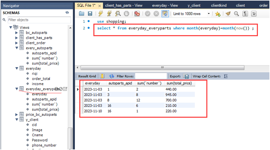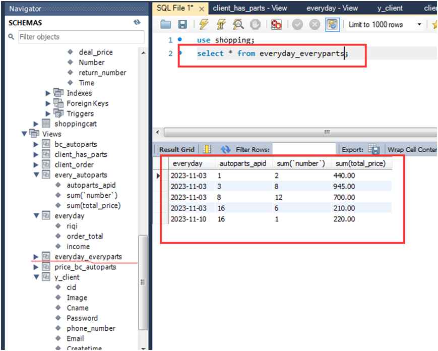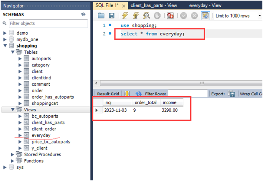 2.定义一个视图可以看出每天每一种汽车配件的销售数量和销售收入。