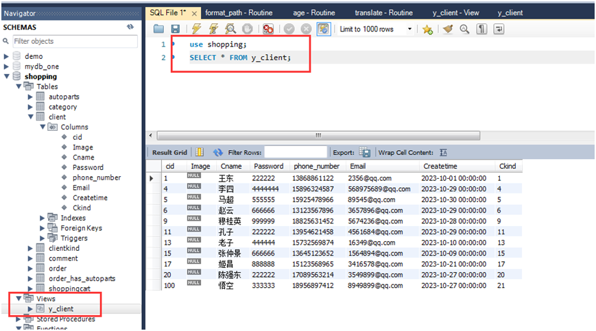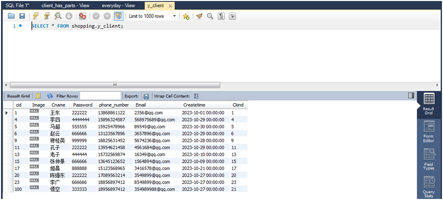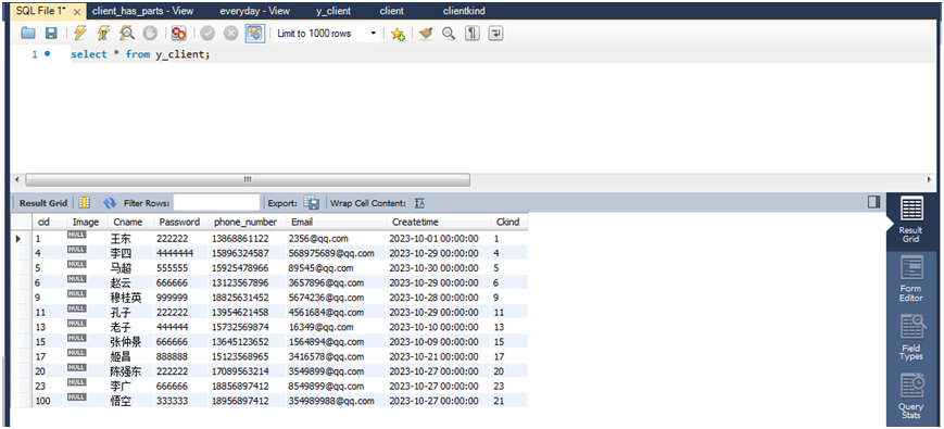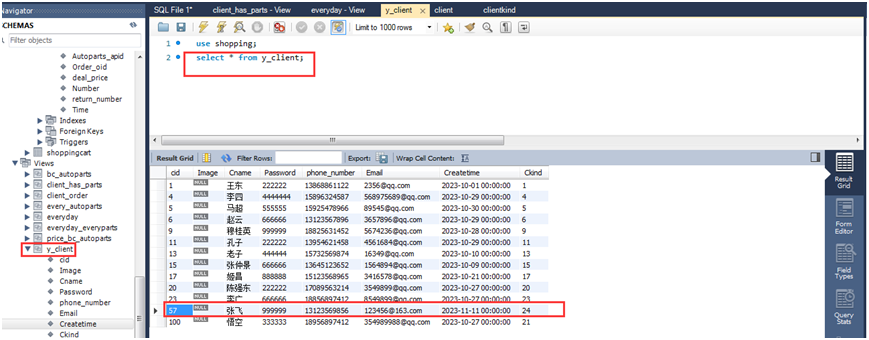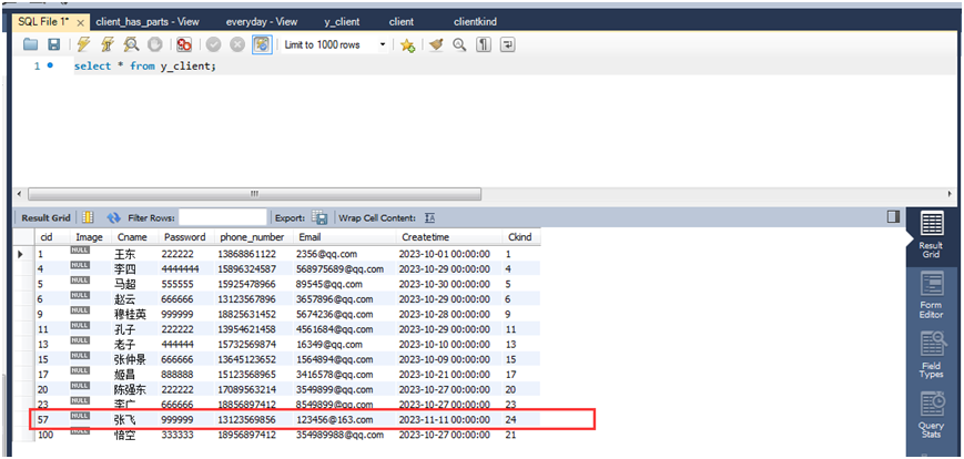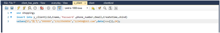 insert into y_client(cid,cname,`password`,phone_number,email,createtime,ckind) values(57,"张飞","999999","131235698856","123456@163.com",date(now()),24);