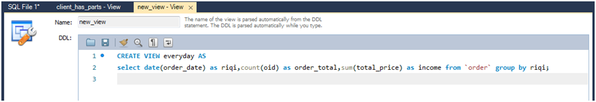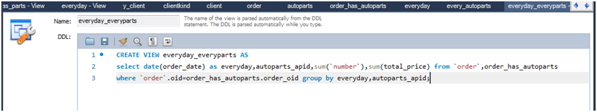 create view everyday_everyparts as select date(order_date) as everyday,autoparts_apid,sum(`number`),sum(total_price) from `order`,order_has_autoparts where `order`.oid=order_has_autoparts.order_oid group by everyday,autoparts_apid;