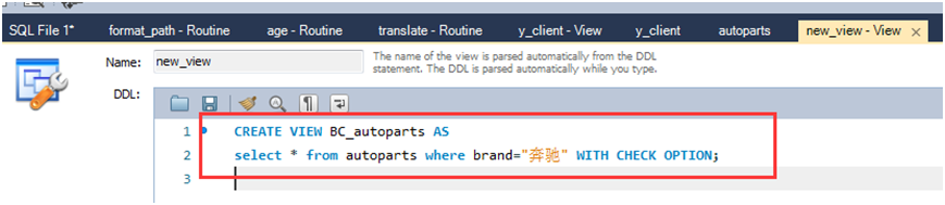 create view BC_autoparts as select * from autoparts where brand="奔驰" with check option;
