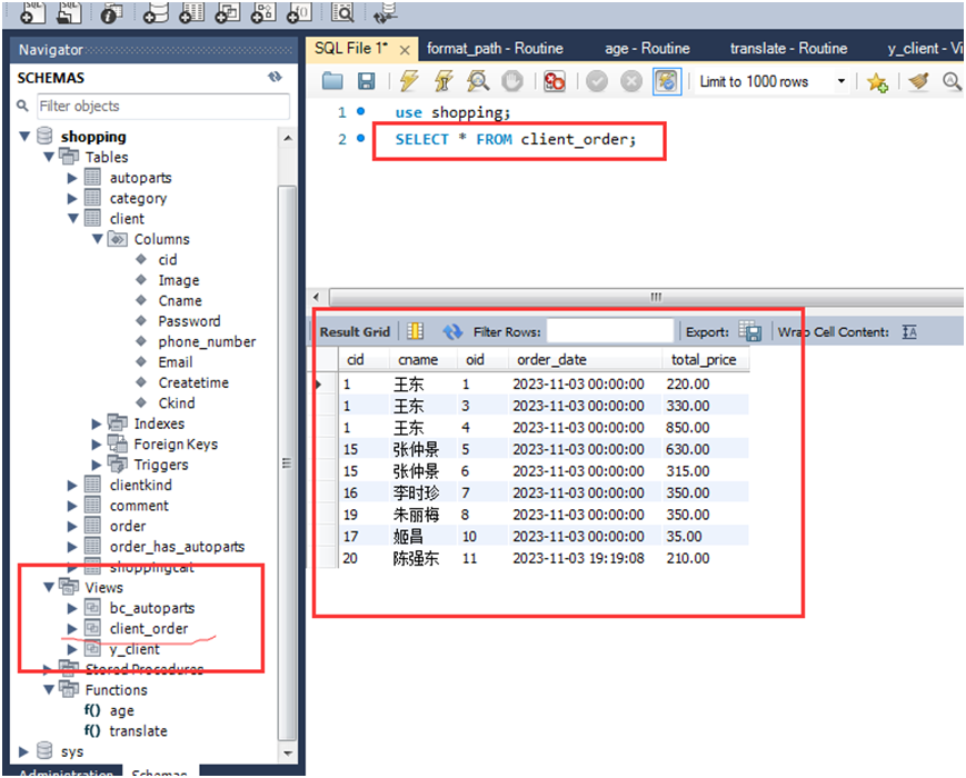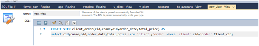 create view client_order(cid,cname,oid,order_date,total_price) as select cid,cname,oid,order_date,total_price from `client`,`order` where `client`.cid=`order`.client_cid;