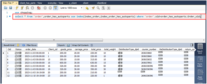 (6)完成订单表和订单明细表的连接查询,在有索引和无索引2种情况下完成查询。