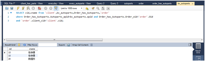 select cid,cname from `client`,bc_autoparts,order_has_autoparts,`order` where order_has_autoparts.autoparts_apid=bc_autoparts.apid and order_has_autoparts.order_oid=`order`.oid and `order`.client_cid=`client`.cid;