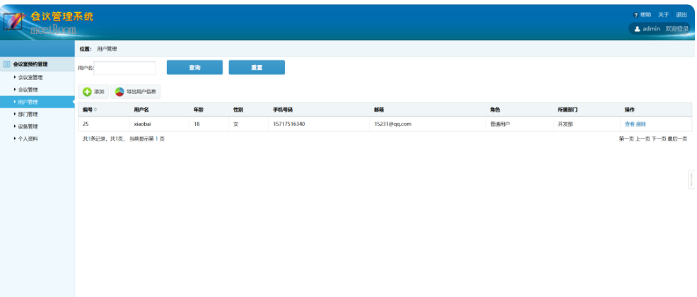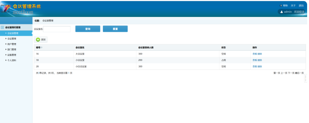 基于SSH实现的会议室管理系统包含两个角色:管理员和普通用户,管理员拥有所有的操作权限,普通用户只能查看对应的功能,限制相关的增、删、该功能。