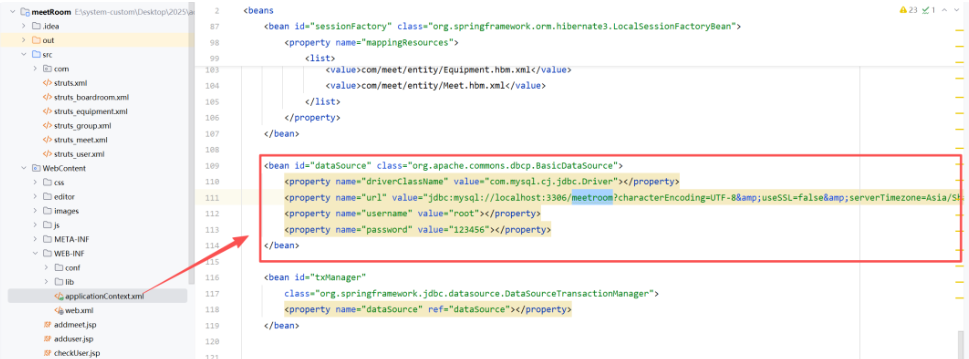 2、修改applicationContext.xml中的数据库配置文件,配置tomcat,运行项目