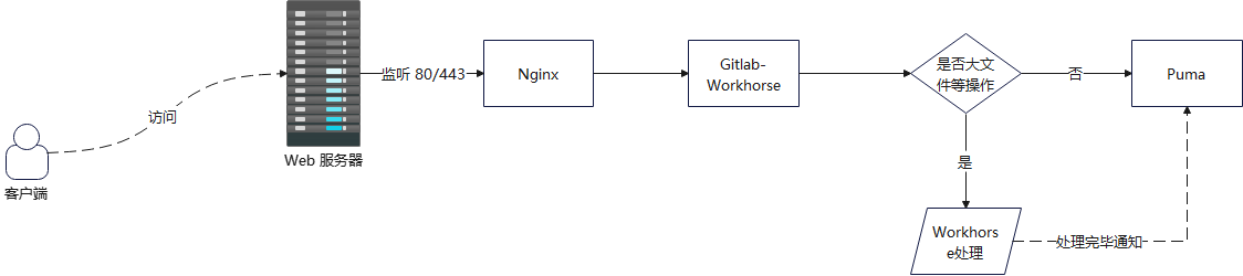 关于 WorkHorse ,可参考官方描述 GitLab Architecture Overview -- Workhorse