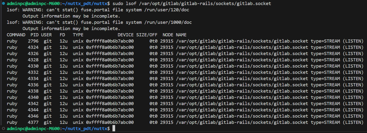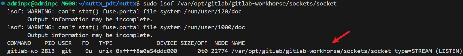sudo lsof /var/opt/gitlab/gitlab-workhorse/sockets/socket