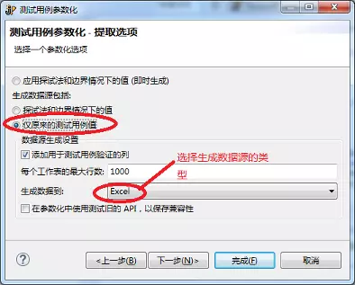 在下一步中选择生成数据源包括:仅原来的测试用例值,并选择对应的数据源文件格式,这里以Excel为例,如下图所示: