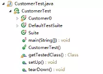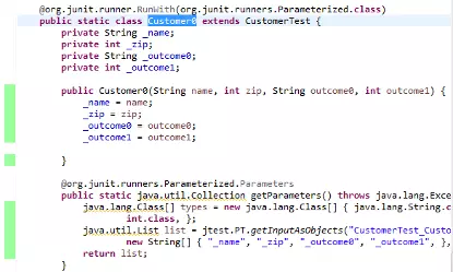 可以看出,在原来的CustomerTest.java文件中增加了一个子类,用于测试Customer方法,在这个子类中首先从数据源获取对应的输入参数,即Excel表格中的_name和_zip列。然后用获取到的参数作为输入值对Customer()方法进行测试,同时在测试方法中断言Customer对象的name和zip的值分别与Excel表格中_outcome0和_outcome1的值相等。