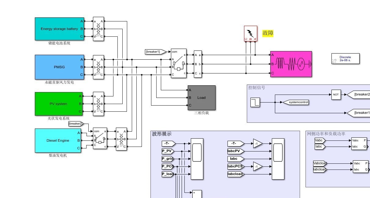 基于matlab风光柴储混合微电网储能电池系统互补能量管理simulink模型 包含风机,光伏,储能,柴油机等系统实现能量相互协调。 波形完美,模型质量!