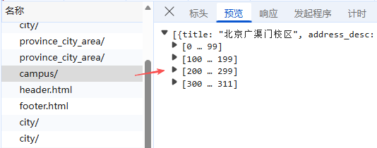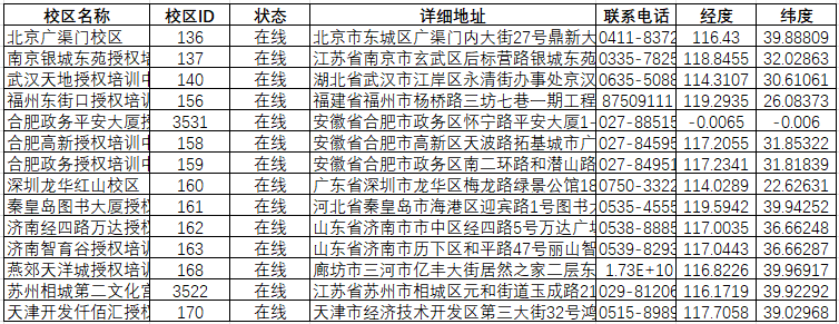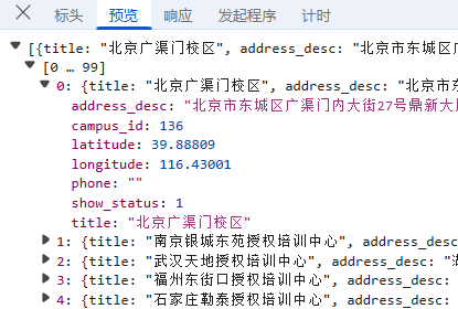获取数据标签如下,title(校区名称)、campus_id(校区ID)、show_status(状态)、telephone(门店电话)、address(门店地址)、lng & lat(地理坐标),其他一些非关键标签,这里省略;