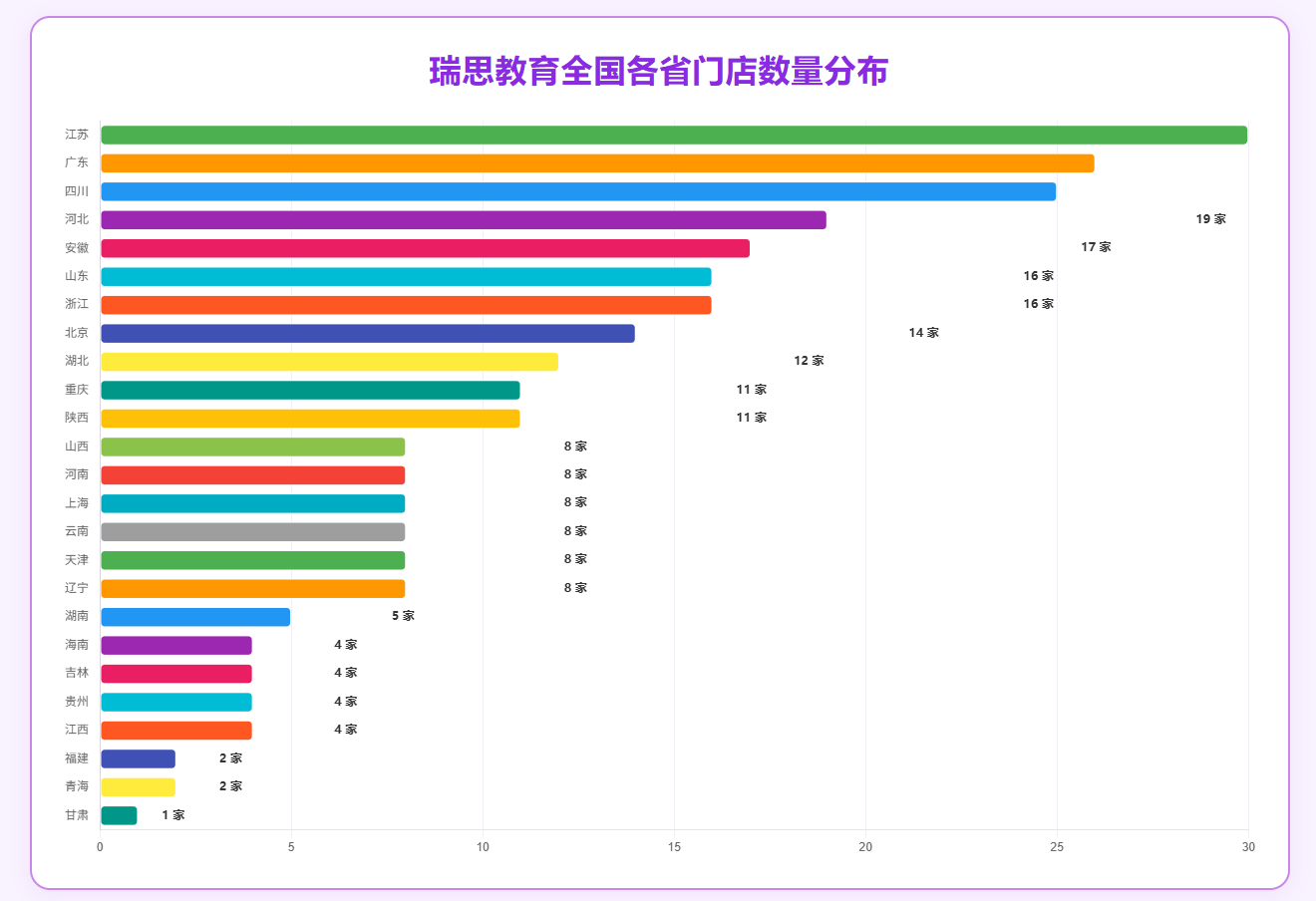 在门店数量较少的地区,湖南(5家)、海南、吉林、贵州、江西(均为4家)、福建、青海(2家)、甘肃(1家) 则显示出明显的市场空白或发展滞后状态。尤其是甘肃仅有1家门店,几乎可以视为"边缘市场",而青海、福建等地虽有少量布局,但尚未形成规模化效应。这表明瑞思教育在西部、东北和部分沿海省份的渗透率仍有较大提升空间。