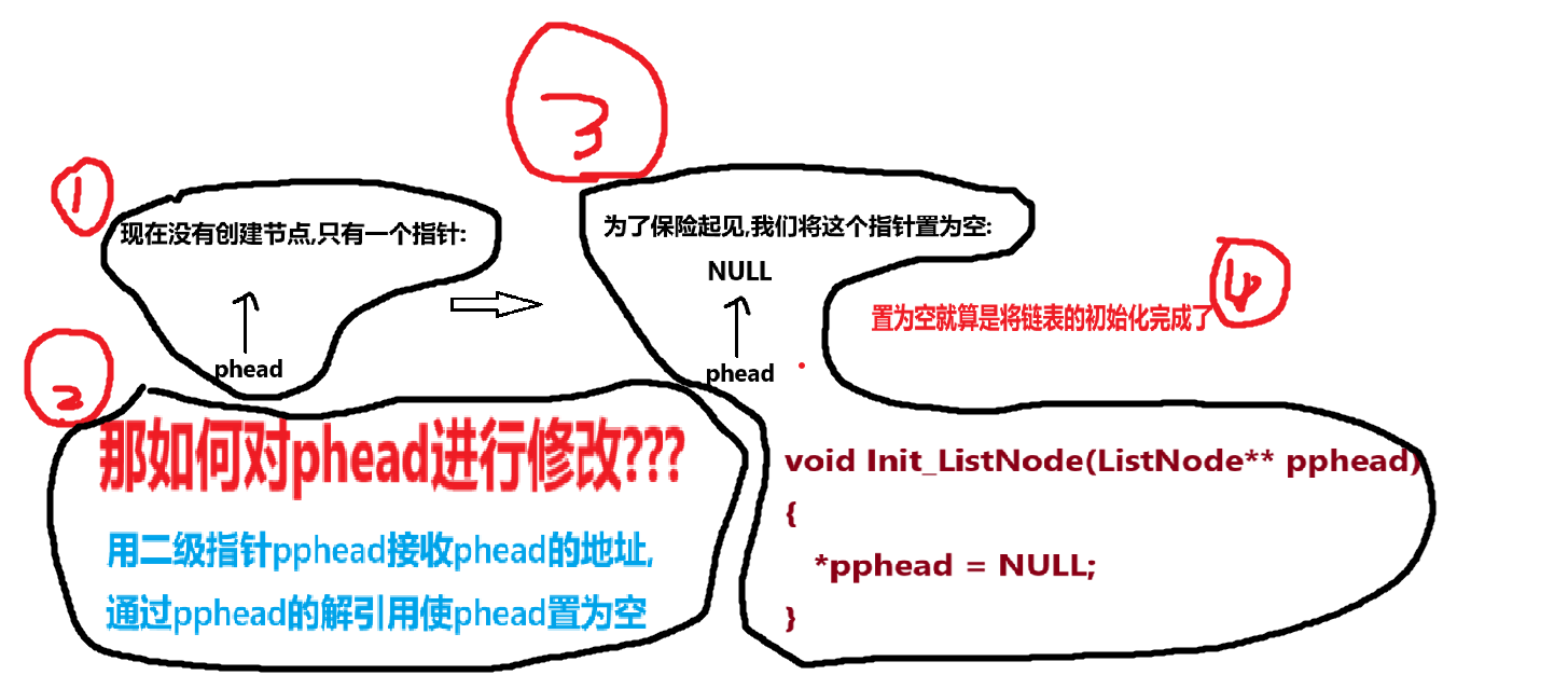 对于这种没有头节点的,我们初始化的方法就不一样了,我们是对第一个节点的指针进行初始化(本质上是对指针内容进行修改),因为在最开始的时候还没有创建链表节点,所以我们要将指向第一个节点的指针置为NULL,这就算是初始化成功了