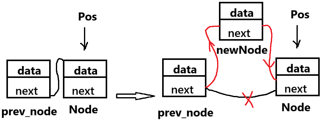 插入操作与顺序表一样,同样分为头插,尾插 ,pos之前之后插入,下面就来一一实现: