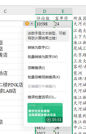 左上角有小绿标的为文本形式,在进行函数计算时可能会出错,所以要转换为数字形式