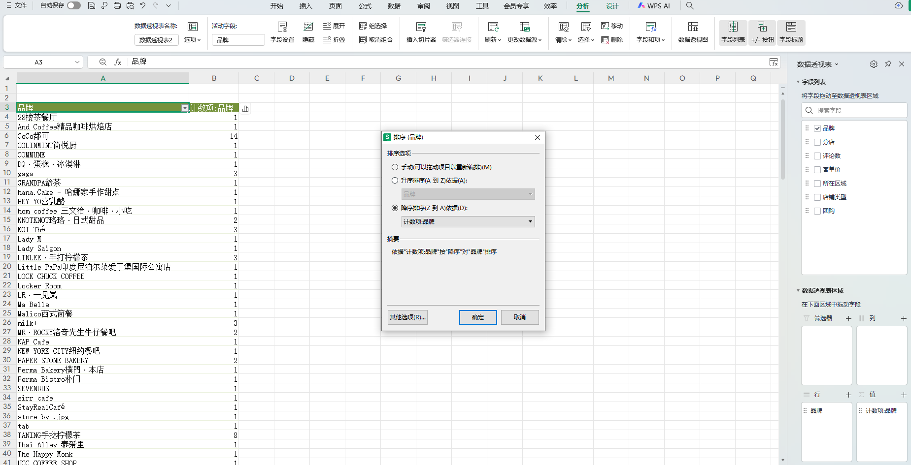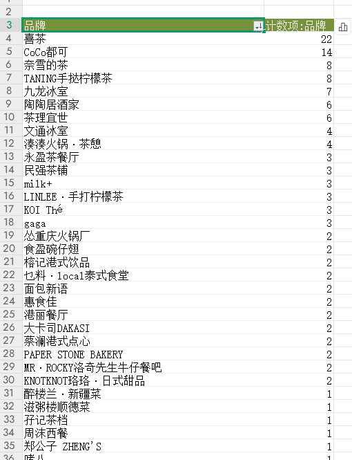 将品牌分别拖到行和值中可以统计品牌的出现次数-从而进行排序