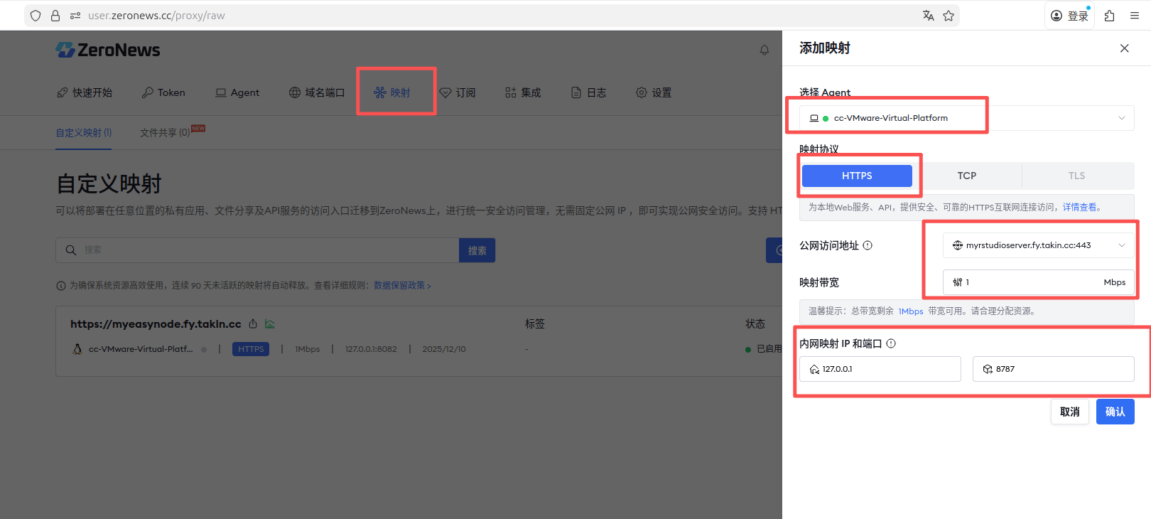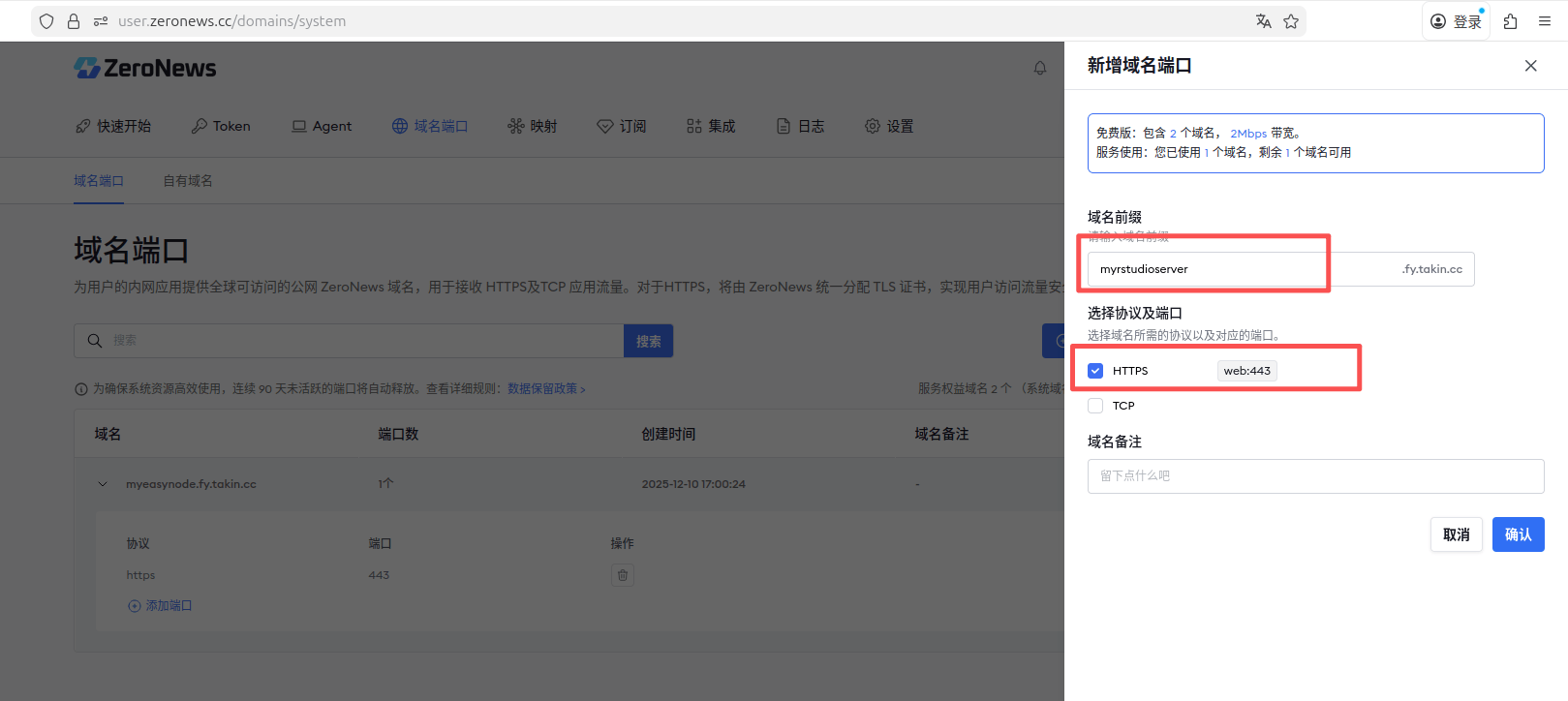 3、 接着,我们在域名端口页面,创建一个可用的公网域名(可自定义前缀),并勾选 HTTPS 协议。