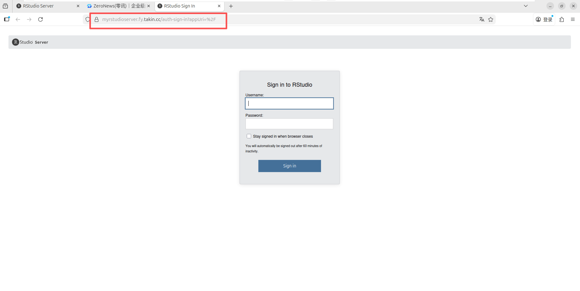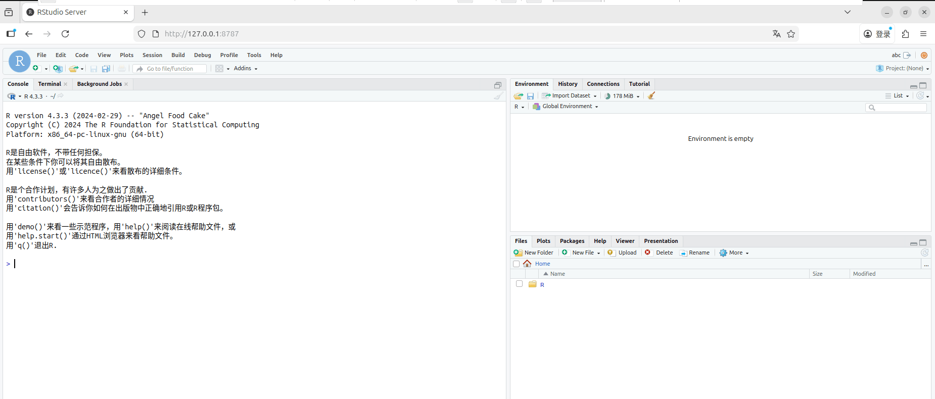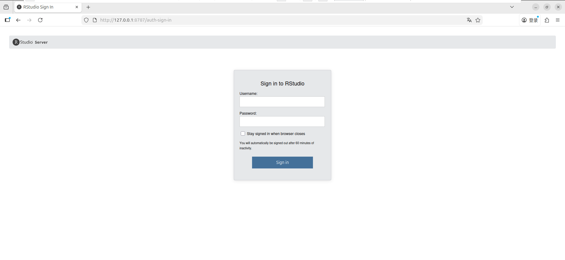 - 上面执行完成之后,在浏览器输入 127.0.0.1:8787,就可以打开 RStudio 的 Web 管理页面