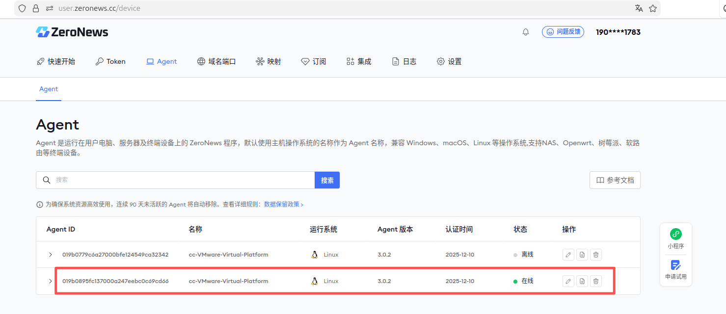 2、 运行完成之后,您可以在 Agent 页面看到已经在线的 Agent 服务。