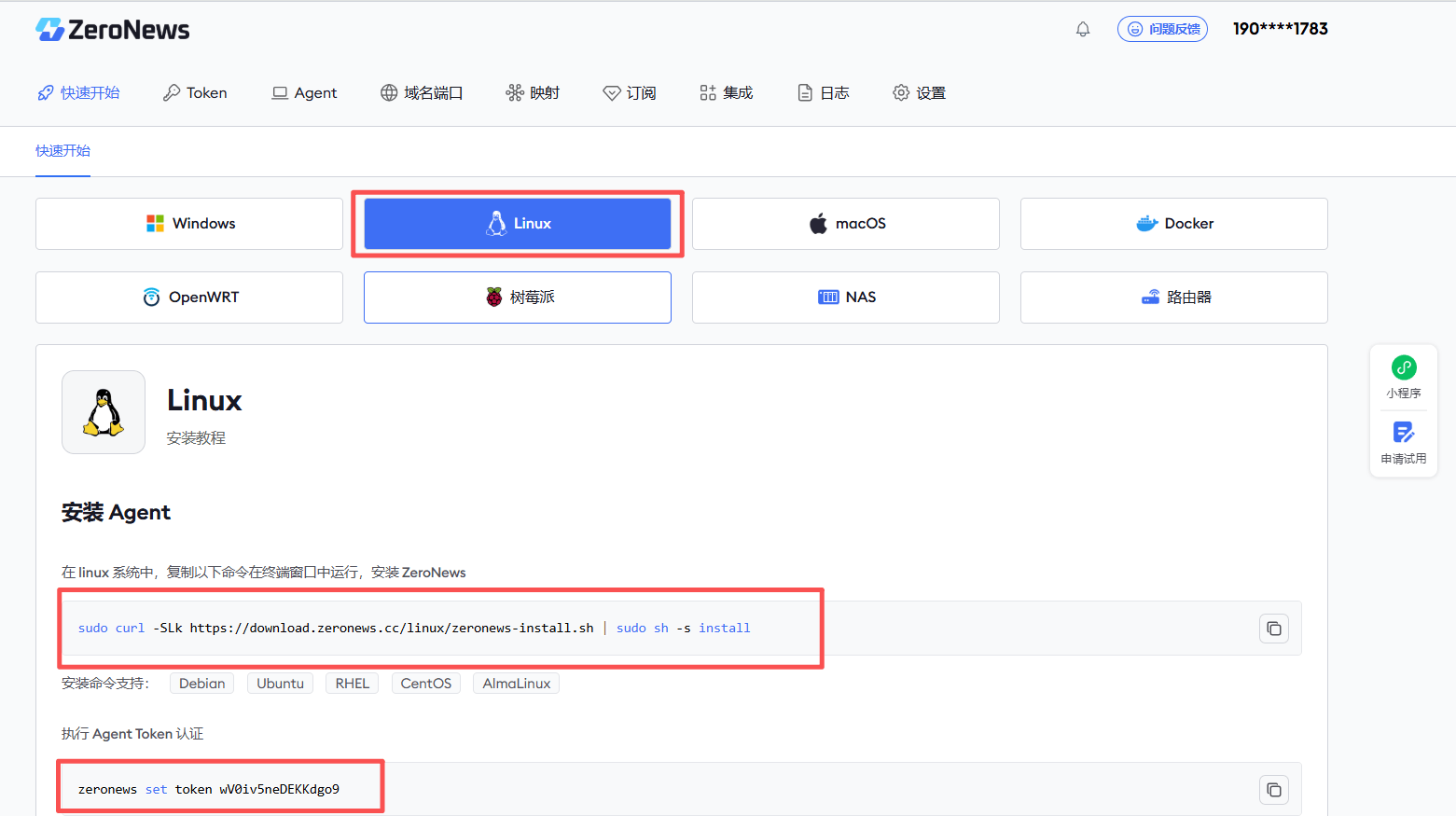 1、 首先,打开 ZeroNews 网站,我们选择Linux ,然后按照步骤执行执行 Agent Token 认证和启动 Agent(执行命令时,使用 root 权限)