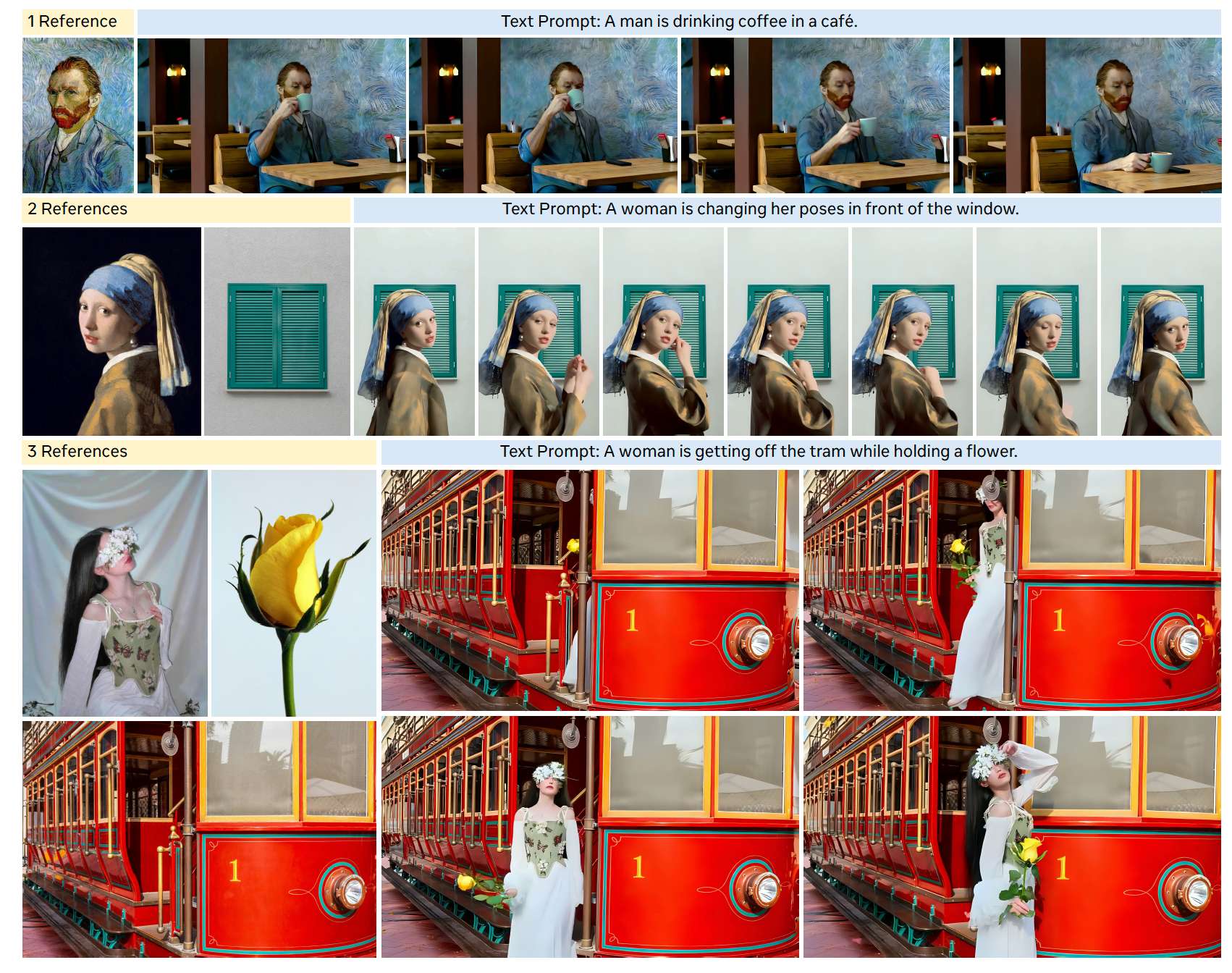 图 1 Saber 是一种仅在视频-文本对上训练的零样本参考到视频方法。它在保持身份和外观的同时,能够在文本提示的引导下,将单个或多个参考图像连贯地融入生成视频中。